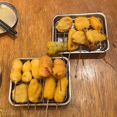 こんばんは。ゆきです❄️ 昨日はドリンク等ありがとうございました🙇♀️ あやと仲良しさんと神社行ったり串カツ屋行ったり韓国料理屋で大好きな苺飴たべて幸せ感じてたり色々楽しかった日! 串あげ久しぶりに食べたなあ🤤 個人的に串カツ屋って安いのにお腹に溜まるの早くて助かるご飯だと思ってる笑笑 沢山食べた!もちチーズ別れてるタイプじゃなくてもちの中にチーズ入ってるタイプでありがてえって話してた😂 珍しい串揚げもあって良かったなあ 楽しい時間過ごしてました.*・゚ ということでそろそろお話終わります🍀*゜