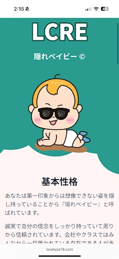 ちょっと気になってた「ラブタイプ診断」をやってみました! 結果はなんと… 👶 隠れベイビータイプ! 意外すぎる結果でびっくり😂 甘えんぼな一面があるらしい…! 自分ではそんなつもりないけど、そう言われるとちょっと納得かも(笑)。 💭 みんなもやってみて! 診断って当たってるような当たってないような不思議さが楽しい✨ 友だちと結果を見せ合うのも盛り上がりそう! まさかの「隠れベイビー」だったけど、 なんか可愛い感じでちょっと嬉しいかも💖