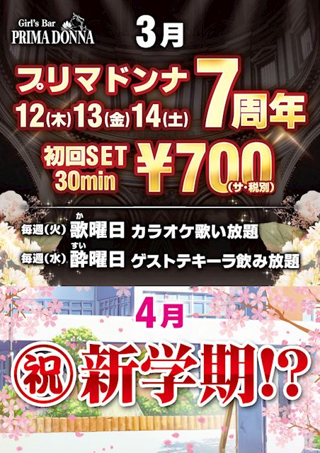 7周年!! 2026年3月6日 こんばんは なんと今月は PRIMADONNA 本八幡店 ㊗️7周年 となります!!🥳🥳 これを祝しまして 3月12,13,14 は、ご新規のお客様 並びに 常日頃よりプリマドンナ本八幡店 を選んでいただいておりますお客様 に感謝の気持ちを込めまして 初回1SET目 ¥700 での提供をさせていただきます😊 この機会をお見逃しすることなく 沢山のお客様が訪れてくれることを 心よりお待ちしております🥰🥰